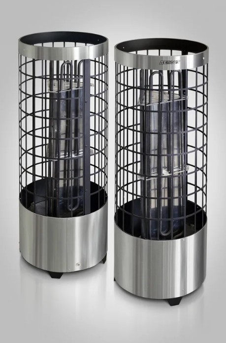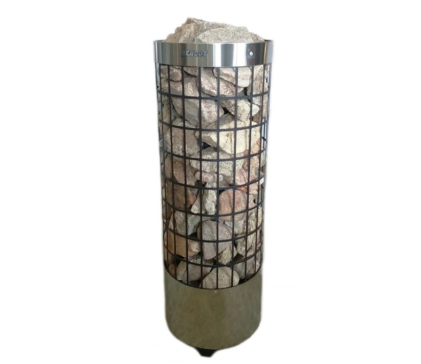 Особенности: цилиндрическая форма с прямоугольными вырезами на всей поверхности (конструкция в виде сетки), что обеспечивает комфортные условия нагрева помещения. Можно регулировать характер тепла от мягкого до сильного: достаточно плеснуть воды на боковую часть каменки или прямо сверху на камни.