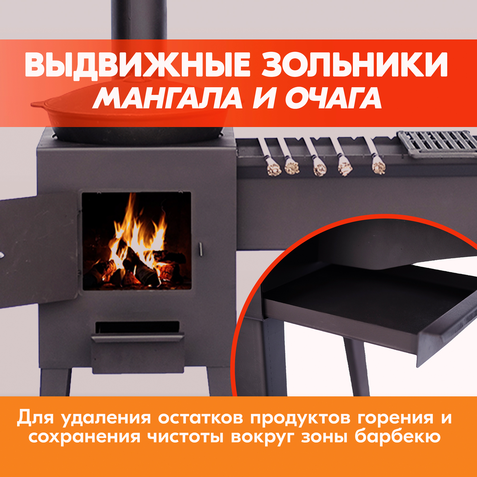 Также мангал для дачи, как и очаг для казана, оснащены выдвижными и емкими зольниками с удобными ручками, позволяющими удалять остатки продуктов горения, сохраняя чистоту вокруг зоны барбекю.