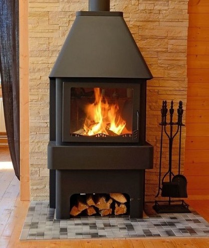 Особого внимания заслуживает уникальная конструкция печи. Благодаря трехстороннему остеклению, вы можете любоваться процессом горения с разных сторон. Например, из кухни или из гостиной.