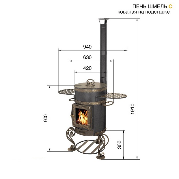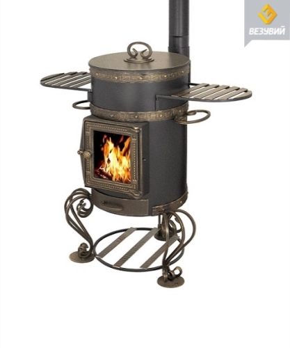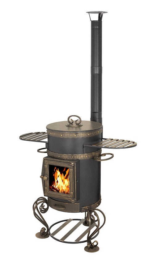 Печь под казан с трубой предназначена для приготовления пищи под открытым небом благодаря тому, что печь под казан имеет высокую вытяжную трубу самоварного типа. Дым, выходящий из трубы, не мешает окружающим. Колосниковая решётка, выполненная из чугуна, выдвижным зольным ящиком позволяет удалить золу при работающей печи. Так же выдвижной зольный ящик дает возможность регулировать интенсивность горения дров в топке.