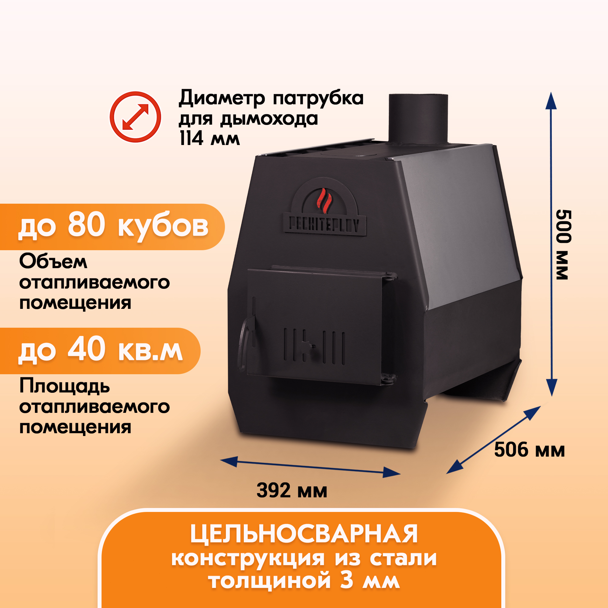 Печи отопительные PECHITEPLOV на 50 и 80 кубов, имеют компактные размеры и небольшую массу, поэтому их легко переместит с места на место и смонтирует один рабочий.